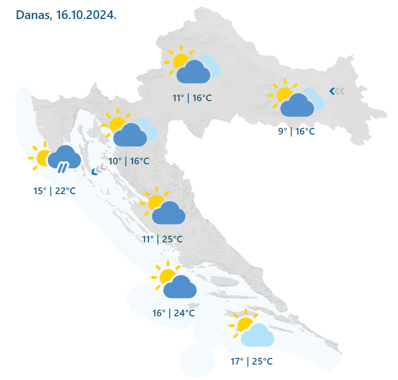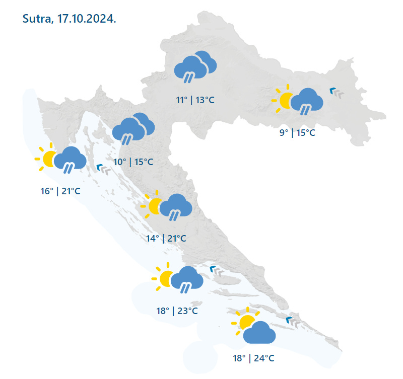 Sutra nas očekuje umjereno i pretežno oblačno, mjestimice s kišom, ponajprije na sjevernom Jadranu i u zapadnim kopnenim krajevima. Vjetar većinom slab, u Podunavlju do umjeren jugoistočni. Na Jadranu slabo i umjereno jugo, popodne u jačanju, a noći i ujutro na sjevernom dijelu još bura. Najniža jutarnja temperatura zraka od 8 do 13, na Jadranu između 15 i 20 °C. Najviša dnevna temperatura od 12 do 17, na moru između 20 i 24 °C., prognoza je DHMZ-a.