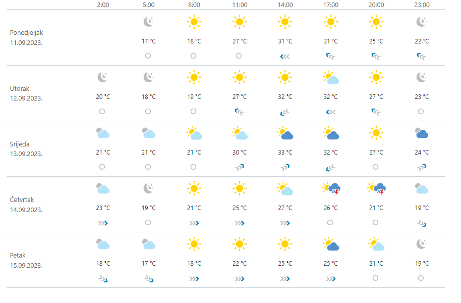 Prema DHMZ-u sutra nas očekuje pretežno sunčano, duž obale i vedro. Ujutro je moguća lokalna kratkotrajna magla, osobito u kotlinama i uz rijeke. Vjetar uglavnom slab, a od sredine dana duž obale će zapuhati vjetar s mora. Najniža jutarnja temperatura zraka u unutrašnjosti od 9 do 14, na Jadranu od 18 do 23, a najviša dnevna uglavnom od 28 do 32 °C.