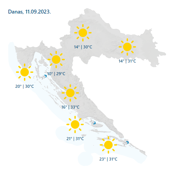 Vrijeme danas većinom sunčano te vrlo toplo i vruće. Ujutro u unutrašnjosti ponegdje kratkotrajna magla. Vjetar na kopnu većinom slab, na Jadranu poslijepodne umjeren jugozapadnjak, prema otvorenom moru sjeverozapadnjak. Najviša dnevna temperatura zraka uglavnom od 29 do 33 °C, podaci su DHMZ-a.
