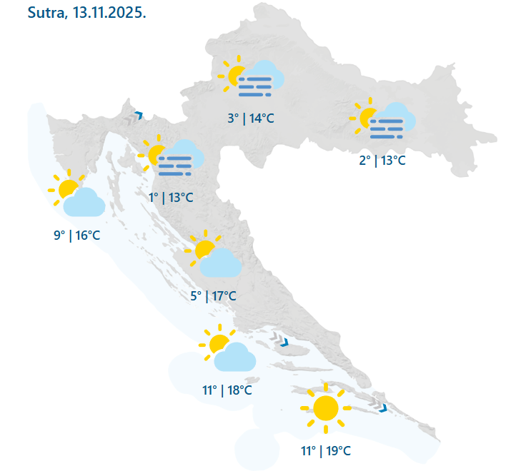 Na Jadranu i u višem gorju pretežno sunčano. Vjetar većinom slab, na Jadranu do umjeren sjeverozapadni, ujutro uz obalu i bura. Najviša temperatura jako će ovisiti o dugotrajnosti magle, na kopnu većinom od 7 do 12, u Gorskom kotaru i Lici i viša, a na Jadranu od 16 do 20 °C, prognozira DHMZ.