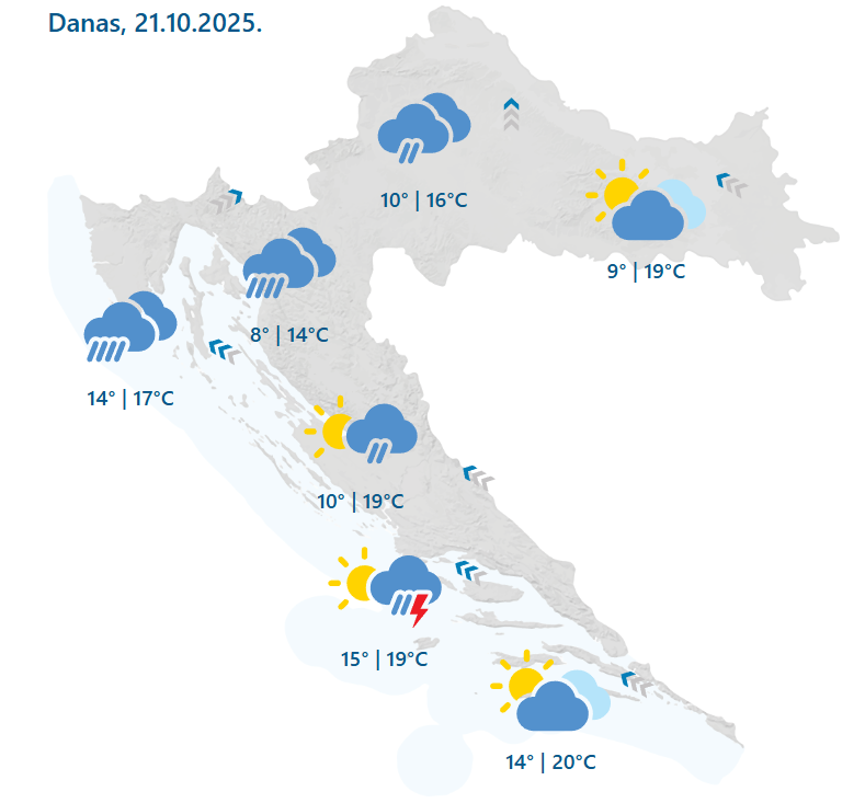 Danas će biti umjereno do pretežno oblačno vrijeme s mjestimičnom kišom, češćom i obilnom na sjevernom Jadranu i u Gorskom kotaru, a na Jadranu i praćenom grmljavinom. U Dalmaciji kiša je vjerojatnija poslijepodne, a na istoku će biti uglavnom suho. Vjetar slab do umjeren jugozapadni, u višem gorju i vrlo jak, ponegdje i južni te jugoistočni. Na Jadranu će puhati umjereno do jako jugo i južni vjetar. Najviša temperatura zraka uglavnom od 15 do 20 °C, prognoza je Državnog hidrometeorološkog zavoda.