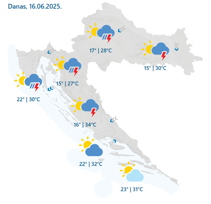Ponedjeljak će biti djelomice sunčan. Oblačnije će biti na zapadu, mjestimice s pljuskovima i grmljavinom, osobito uz granicu sa Slovenijom, a poslijepodne i drugdje. Lokalno je moguće i nevrijeme. Zapuhat će umjeren sjeverni i sjeveroistočni vjetar, a na sjevernom Jadranu bura, podno Velebita i jaka s olujnim udarima, dok će u Dalmaciji bura zapuhati tek navečer. Najviša dnevna temperatura bit će između 26 i 31, u Dalmaciji do 34 °C, navodi u vremenskoj prognozi Državni hidrometeorološki zavod (DHMZ).