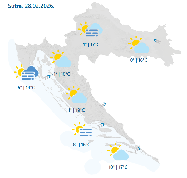 Iako smo na samom kraju veljače, vrijeme će ovoga vikenda više podsjećati na rano proljeće nego na završetak zime. Temperature će se penjati i do 19 stupnjeva, što je iznad prosjeka za ovo doba godine, a prevladavat će sunčano i stabilno vrijeme, uz čestu jutarnju maglu u unutrašnjosti.